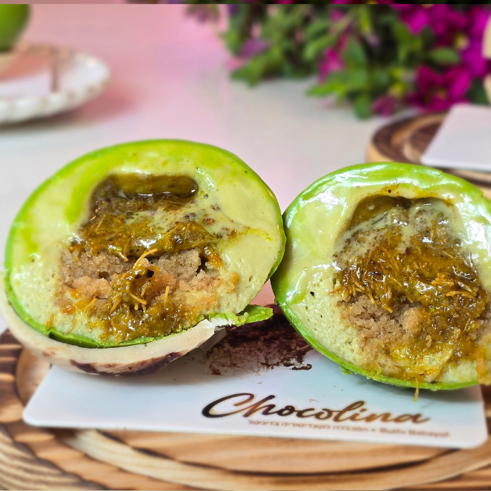 גנאש על בסיס מסקרפונה למרקם קטיפתי וליבת ג'ל מנגו ונענע מרעננת. טכניקת צביעה למראה פרי בשל על פיננסייר פקאן עשיר וחמאה חומה.