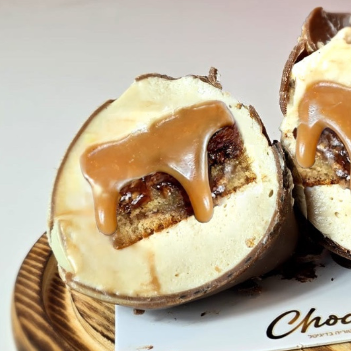 מוס אספרסו על בסיס קרם אונגלז בתוך כוס שוקולד מטומפרר. ליבת פרלינה וניל שנשפכת בחיתוך על פיננסייר פקאן וחמאה חומה! ריסוס עדין המדגיש את הכיתוב .